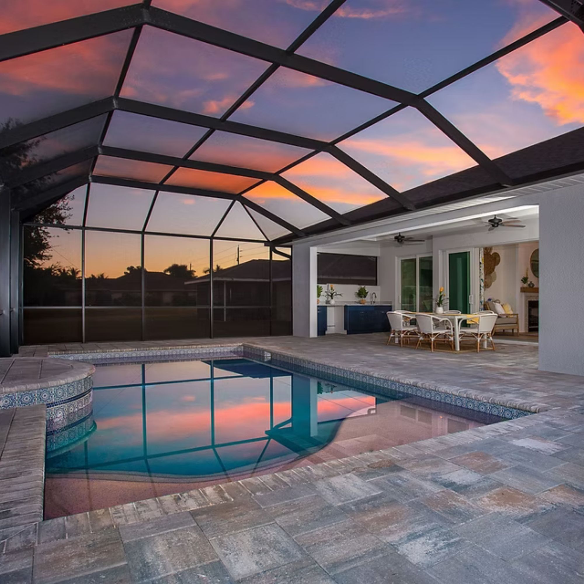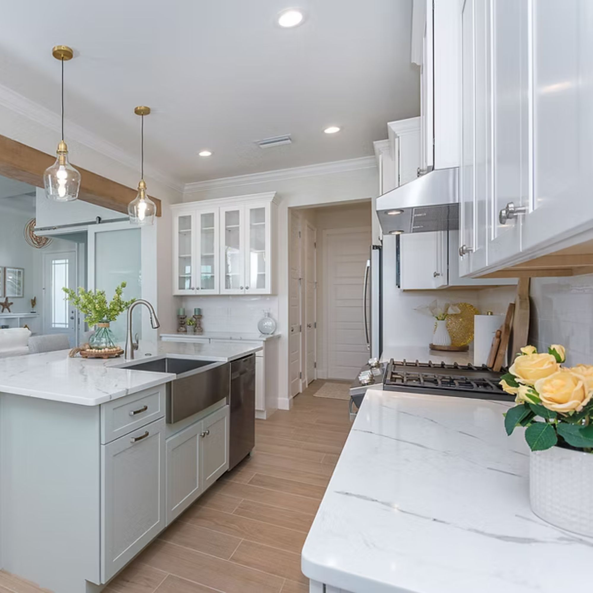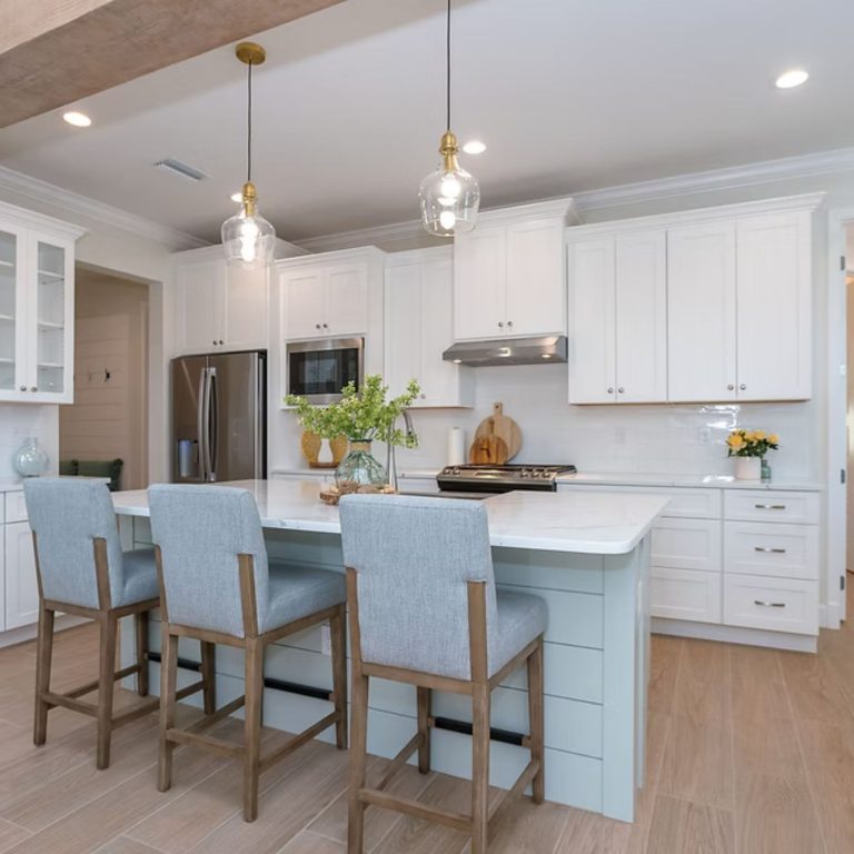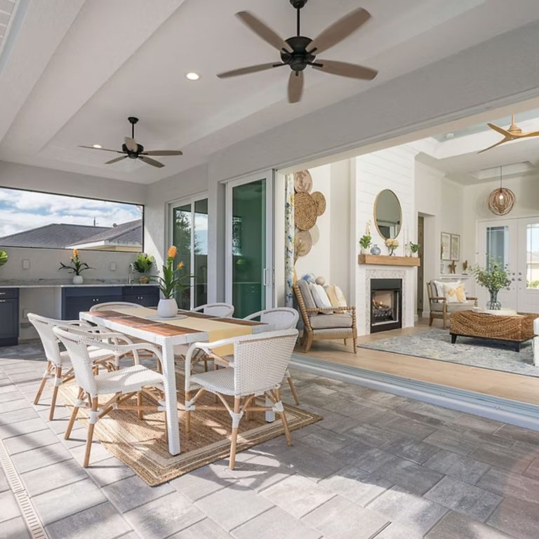 The Juniper is organized around a central living core that connects kitchen, dining, and great room without interruption. The oversized island anchors the space, while pocket sliding glass doors extend it outward to the lanai.