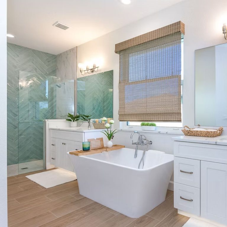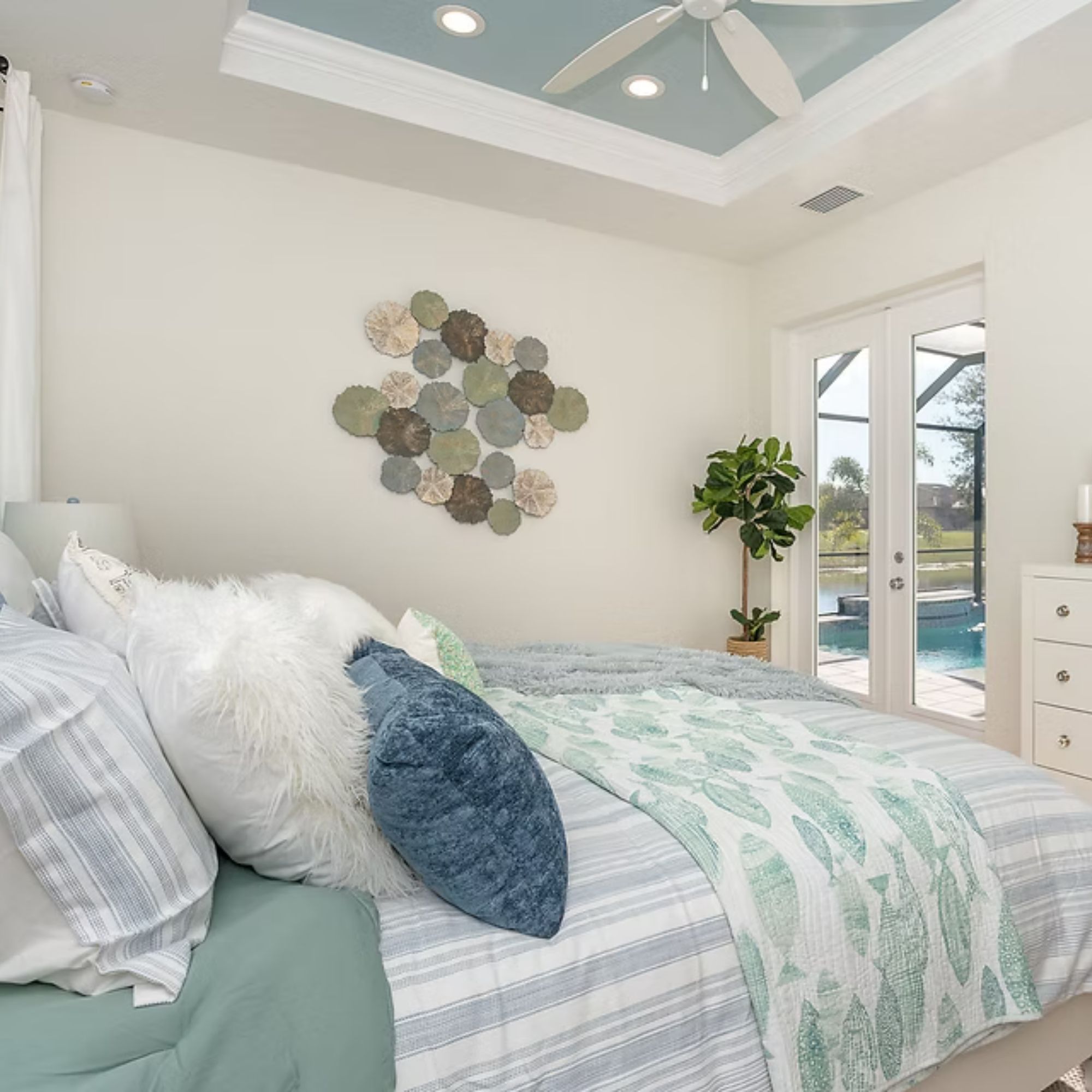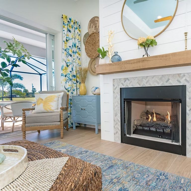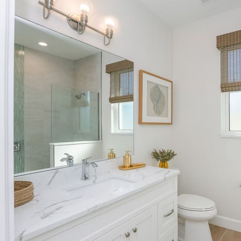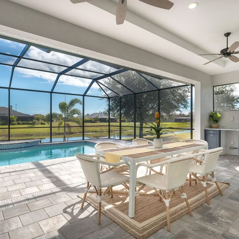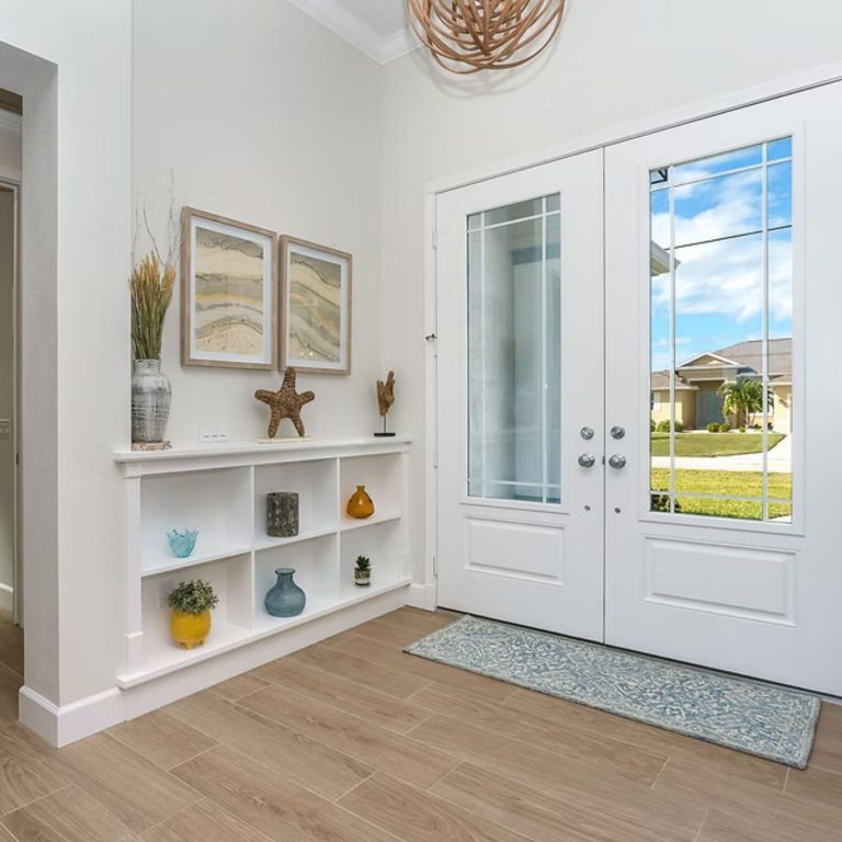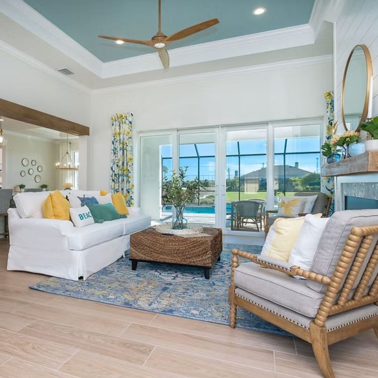 The Juniper is designed around a central living space that connects directly to the kitchen, dining, and lanai. An oversized island anchors the kitchen, while pocket sliding glass doors open the main area outward. The owner’s suite is positioned for privacy and includes direct access from the walk-in closet to the laundry room. Secondary bedrooms are set on the opposite side, keeping separation without breaking the flow of the home.