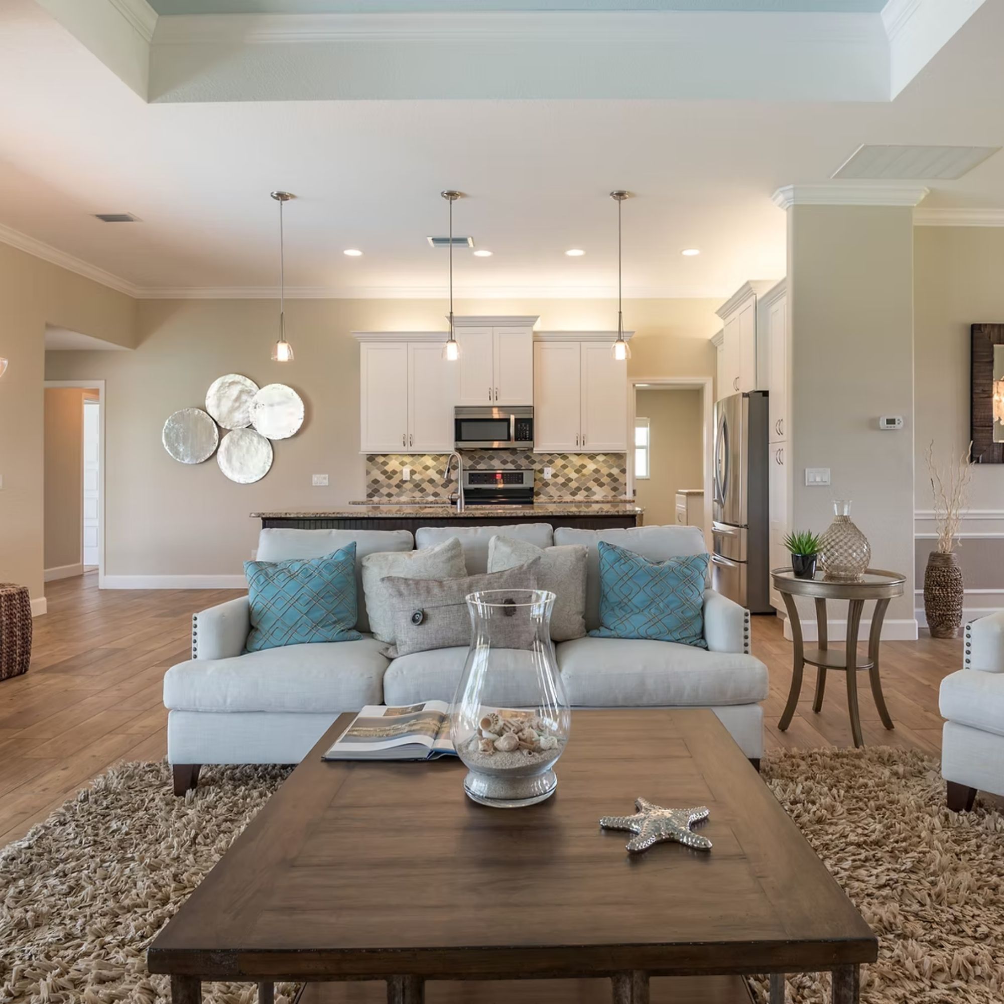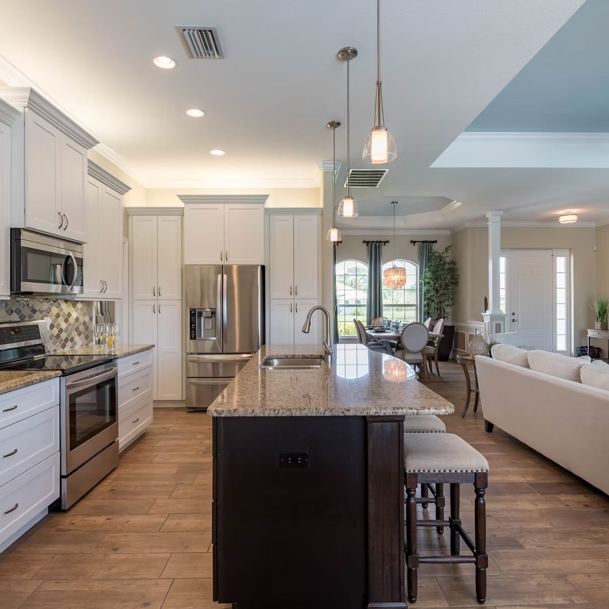 The Westbury II is designed to support larger living without losing clarity. The main living area unfolds across the kitchen, dining, and great room, creating a central space that feels open while remaining structured. Expansive openings extend the home outward to the lanai, maintaining a natural connection between indoor and outdoor living. The kitchen is positioned to stay engaged with the home while functioning efficiently at scale. Private spaces are placed with clear separation, allowing the owner’s suite to remain quiet and removed, while secondary bedrooms stay easily accessible without interrupting the flow of the main living areas. Every element is arranged to create a home that feels intentional, balanced, and easy to live in.
